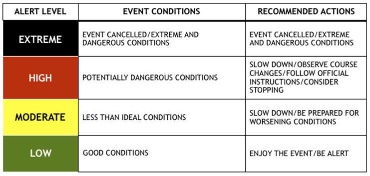The Event Alert System, or EAS, is a color-coded method of quickly communicating to participants the potential for adverse weather conditions that can affect the race event. A series of color codes is used to indicate the increasing severity of adverse conditions as outlined below: